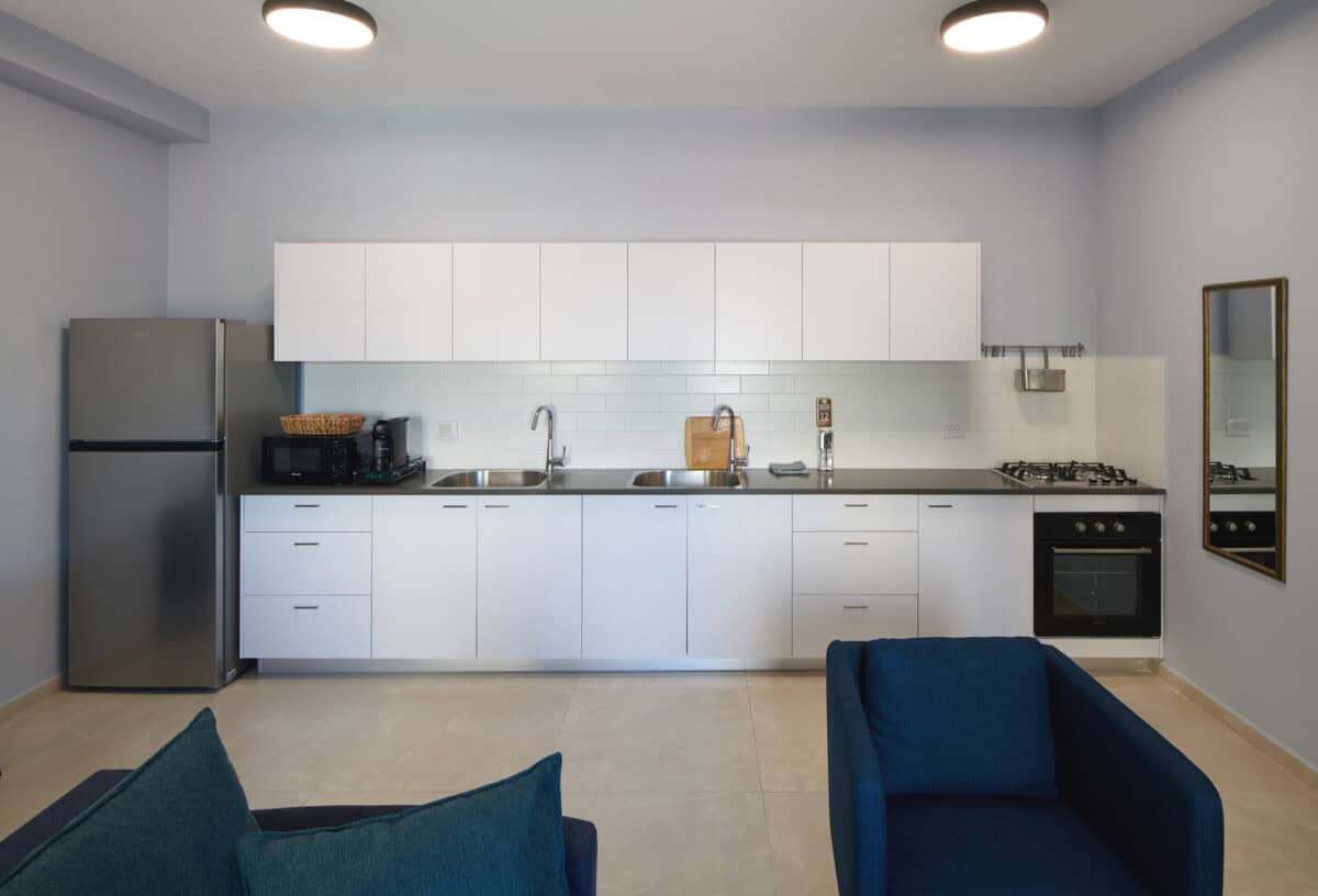 The fully equipped kosher kitchen is ideal for traditional families. It includes separate meat and dairy utensils, a water filtration system, a large refrigerator, an oven, a stovetop, a microwave, and an electric kettle. Everything you need for cooking and serving meals is provided, ensuring a comfortable and seamless stay.